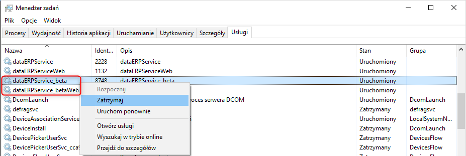 Po dokonaniu powyższych czynności należy ponownie uruchomić działanie programu dataERPService_beta oraz dataERPService_betaWeb.