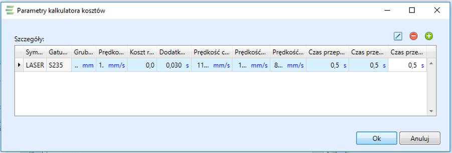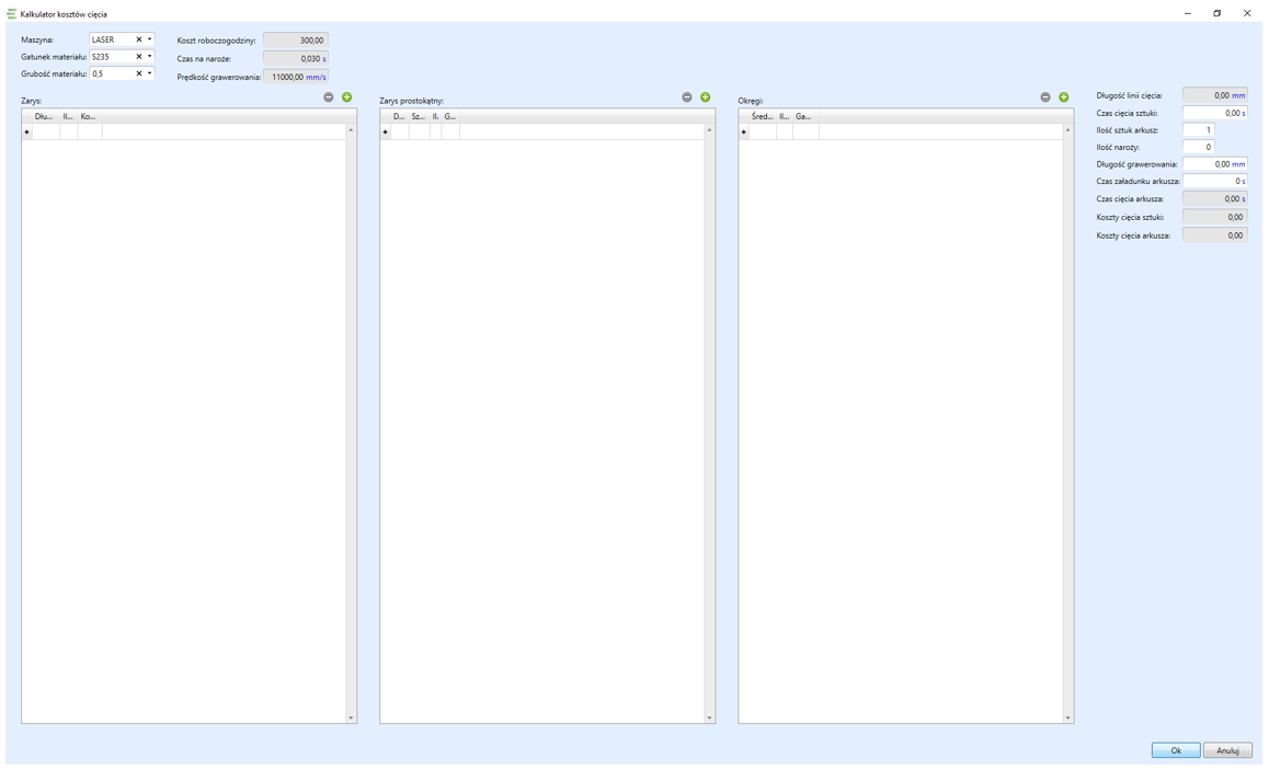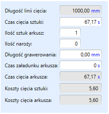 Po prawej stronie okna automatycznie sumują się wprowadzone parametry z wszystkich trzech kolumn a tym samym zostają obliczone czasy cięcia oraz jego koszty: