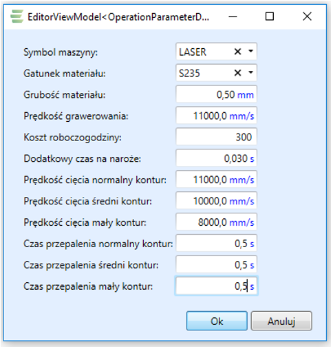 Po otworzeniu Operacji znajdujących się w zakładce Konfiguracja należy wybrać operację wycinania laserowego a następnie przejść do Parametry kalkulatora kosztów: