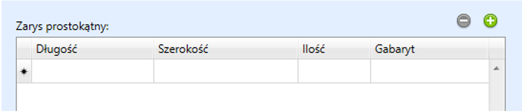 Adekwatnie do poprzedniej kolumny w Zarys prostokątny należy uzupełnić długość, szerokość, liczbę sztuk oraz gabaryt (kontur).