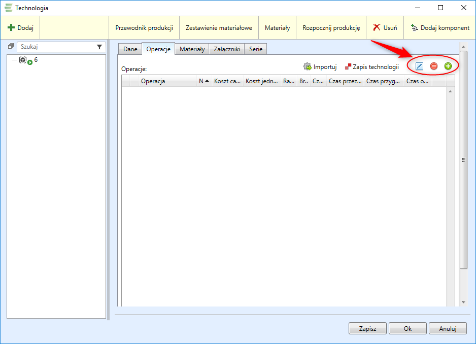 W zakładce Produkcja należy wybrać operację Technologia, gdzie należy dodać nową operację: