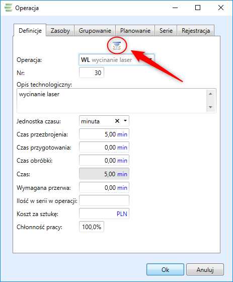 Zdefiniowanie parametrów operacji