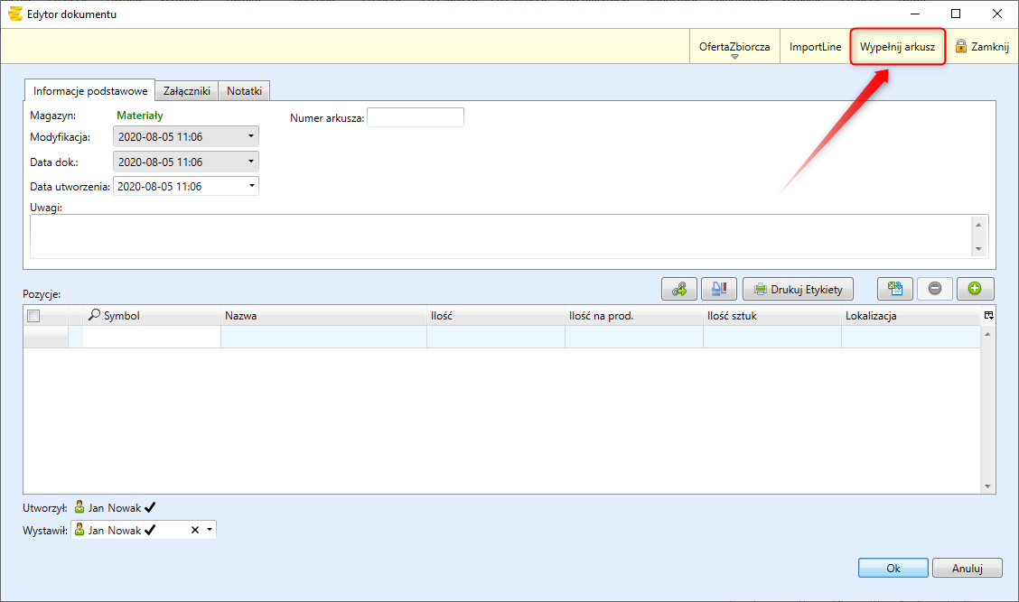 Następnie w nowo utworzonym oknie Edytor dokumentu przycisk Wypełnij arkusz pozwoli na wybór obszaru spisowego.