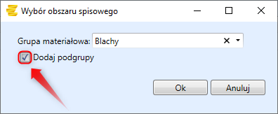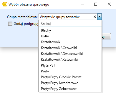 Z listy należy dokonać wyboru grupy materiałowej. Na jednym dokumencie spisowym istnieje możliwość dodawania pozycji z różnych grup materiałowych.