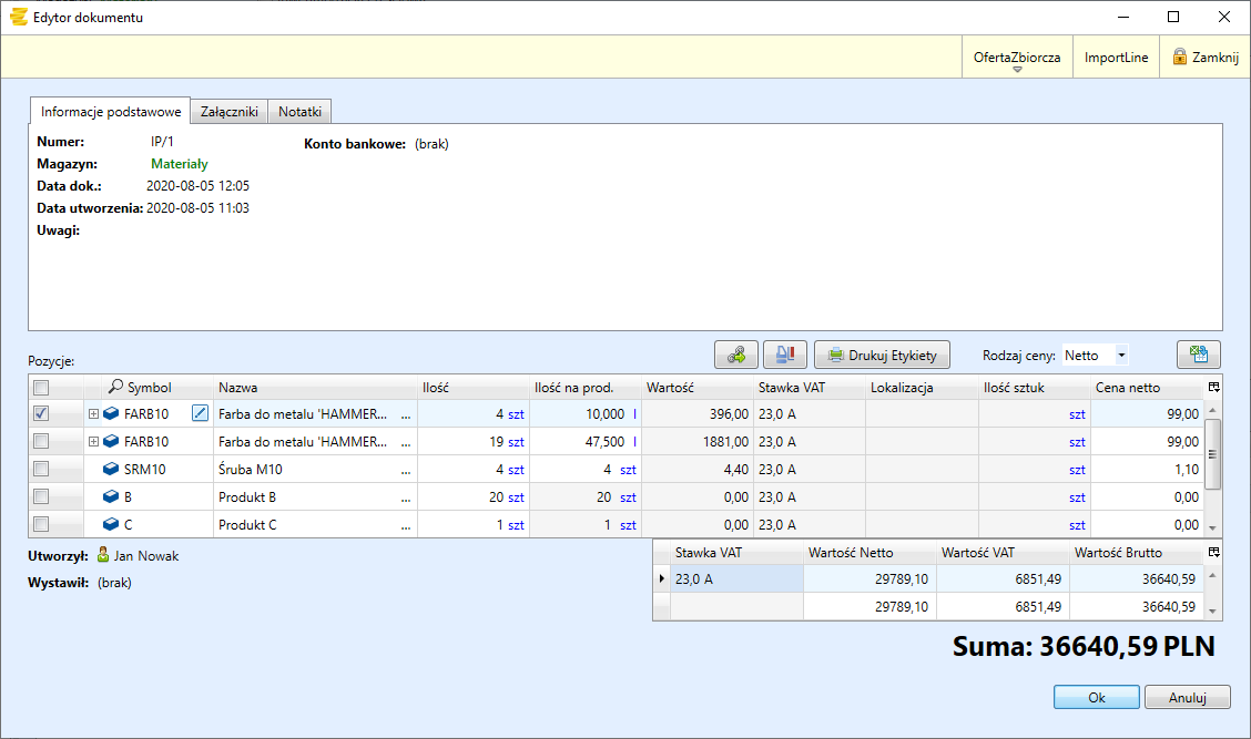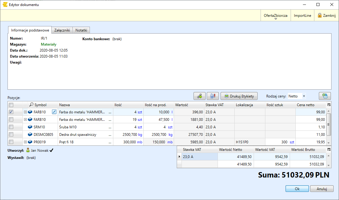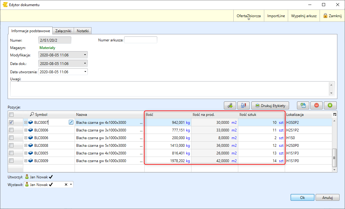 Do dokumentu zostaną wprowadzone pozycje wraz ilościami znajdującymi się na stanie magazynowym. Dane w kolumnie ilość należy zweryfikować ze spisami dot. nadmiarów i niedoborów towarów.