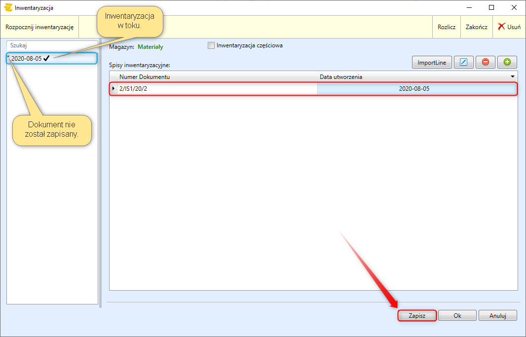 W oknie Inwentaryzacja zostanie dodany dokument inwentaryzacyjny wraz z jego numerem np. 2/IS1/20/2. Symbol * , który pojawił się obok daty utworzenia dokumentu oznacza, że zostały wprowadzone zmiany w dokumencie ale nie zostały zapisane, tak więc należy wybrać przycisk Zapisz, aby dane nie zostały utracone.