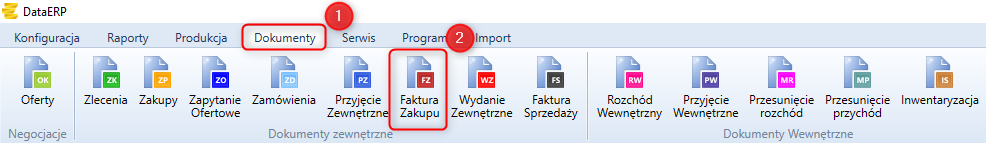Faktury zakupu można wprowadzić w programie DataERP otwierając menu Dokumenty -> Faktury zakupu.