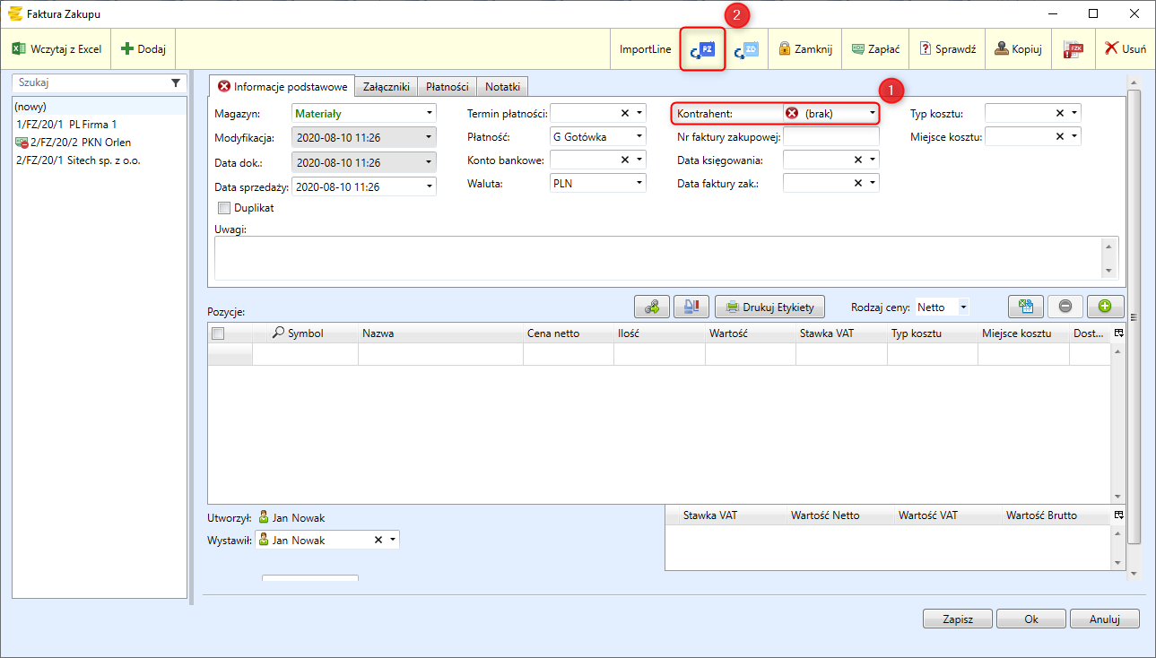 W oknie nowego dokumentu Faktury Zakupu w pierwszej kolejności należy wypełnić pole z nazwą kontrahent, kolejno za pomocą przycisku PZ zaimportować dane do faktury z konkretnego dokumentu przyjęcia zewnętrznego.