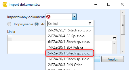 Ze strony programu DataERP pojawi się komunikat o wybraniu dokumentu PZ. Dokumenty, które pojawią się do wyboru będą dotyczyły dokumentów PZ dla konkretnego kontrahenta.