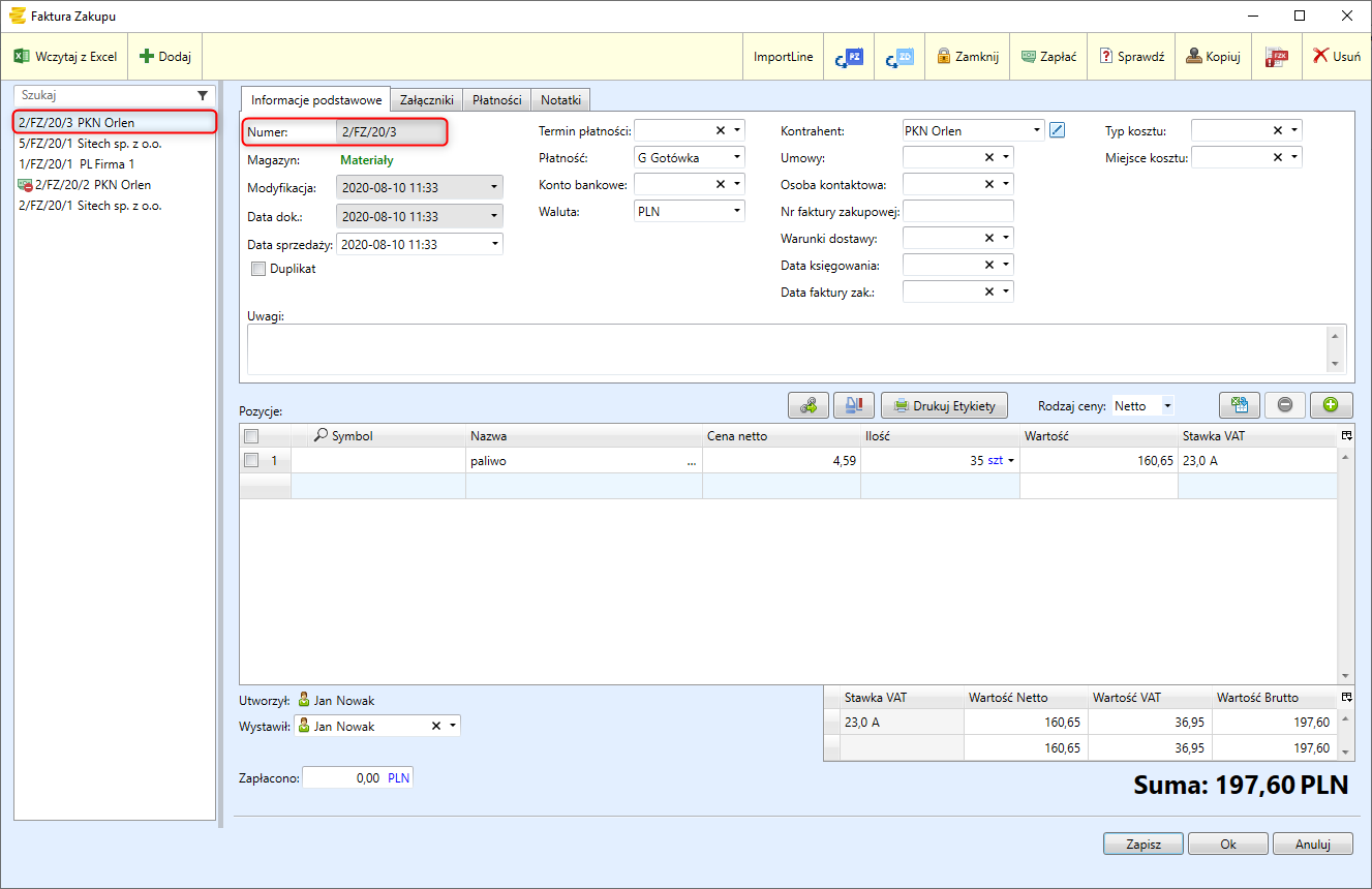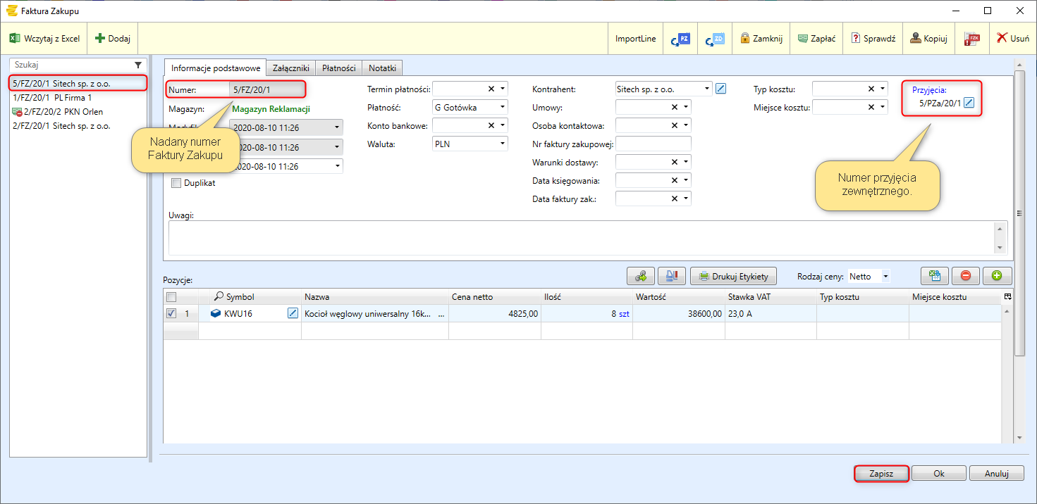 Numer dokumentu przyjęcia zewnętrznego, na którego podstawie została wygenerowana faktura zakupu, pojawi się w dokumencie w prawym górnym rogu, a wybranie przycisku Zapisz spowoduje zapisanie dokumentu oraz nadanie numeru Faktury Zakupu.