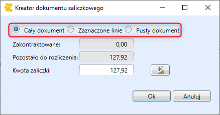 W celu utworzenia Profomy na całą kwotę Oferty, należy nacisnąć przycisk FPR+ i zaznaczyć opcję cały dokument. W polu kwota zaliczki automatycznie zostanie wczytana wartość Oferty.