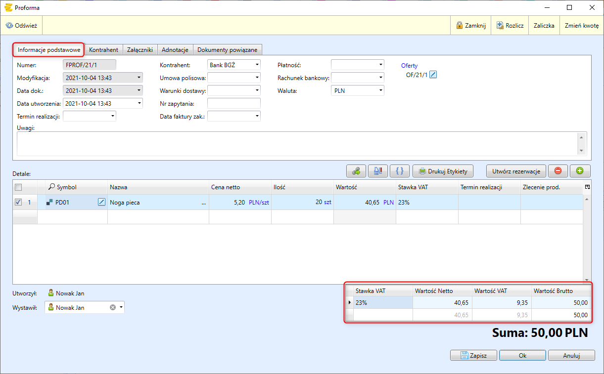 Po uzpełnieniu informacji podstawowych i zapisaniu danych utworzony zostaje dokument Proforma.