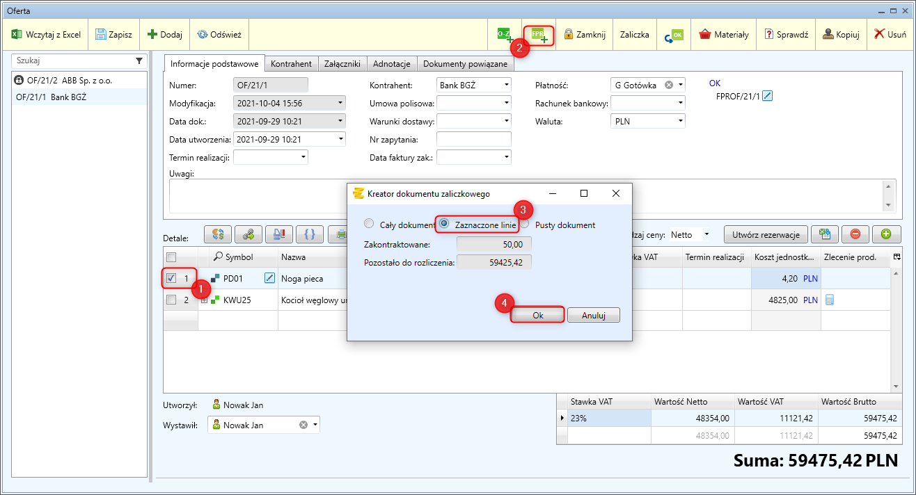 Przykład - utworzenie Proformy na część kwoty Oferty