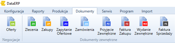 - Przychodowe: Zamówienie, Faktura Zakupu, Przyjęcie Wewnętrzne, Przyjęcie Zewnętrzne.