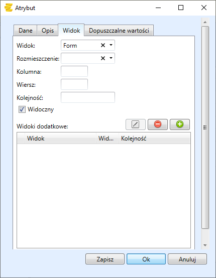 W zakładce Widoki należy określić w jaki sposób będą wyświetlane dane poprzez wybór z listy Widok opcji: Formularz, Lista, Tabela, Tabela Częściowa, Edytor, Kreator, Szczegóły. Następnie przejść do wiersza Rozmieszczenie i określić miejsce wyświetlania się Atrybutu w oknie szablonu do którego jest przypisany. Dla każdego typu Widoku Rozmieszczenie jest określane w następstwie wyboru pola Przypisany do.