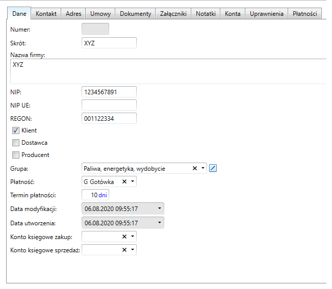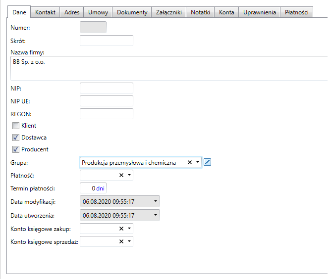 Pojawi się puste okno z dodatkowymi zakładkami. W zakładce Dane należy podać podstawowe informację na temat kontrahenta typu: skrót, nazwa firmy, NIP, Regon. Istnieje możliwość określenia czy jest to dla przedsiębiorstwa klient,dostawca lub producent. W łatwy sposób można tego dokonać poprzez zaznaczenie jednego z nich. Dopasować kontrahenta do odpowiedniej grupy, nakreślić formę płatności wraz z terminem do zapłaty.