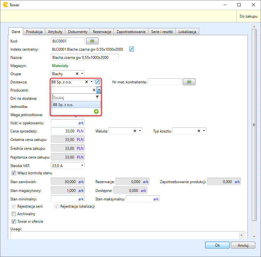 W zakładce Towary do danego indeksu materiałowego można przypisać producenta oraz dostawcę.