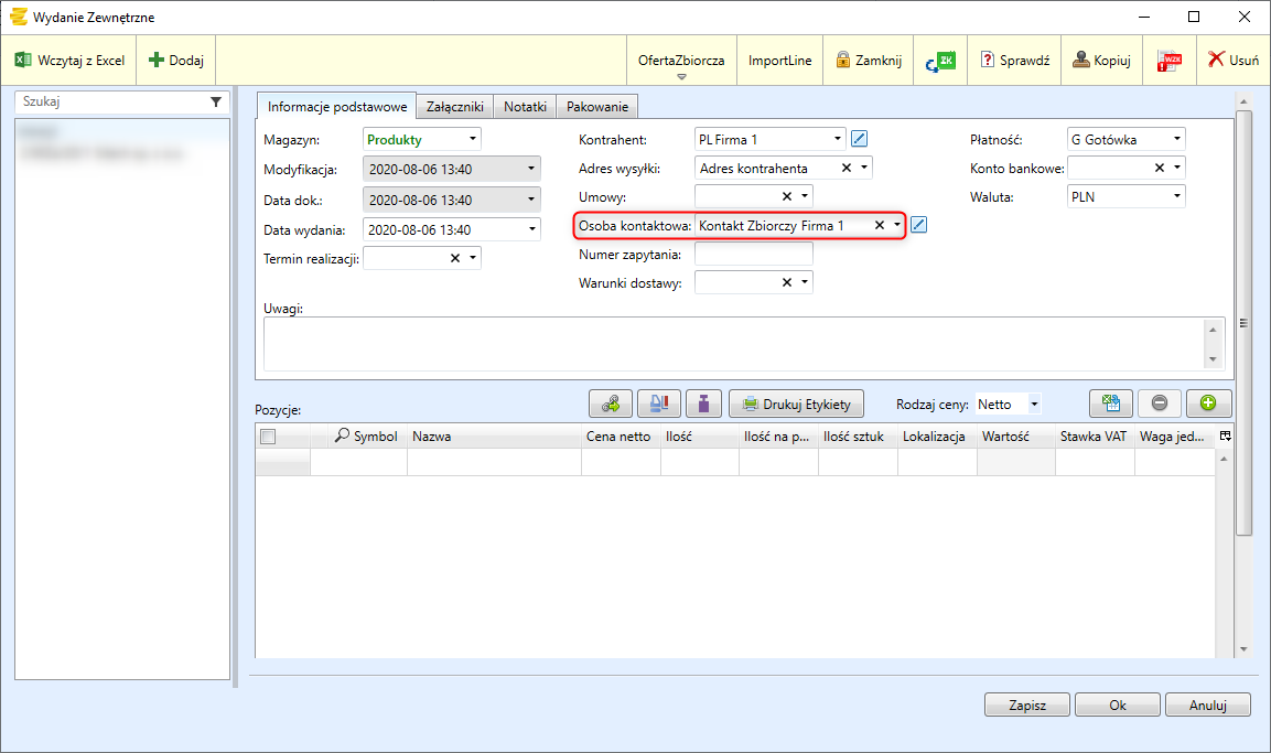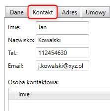 W zakładce Kontakt można uzupełnić pole z danymi osoby kontaktowej ze strony kontrahenta.