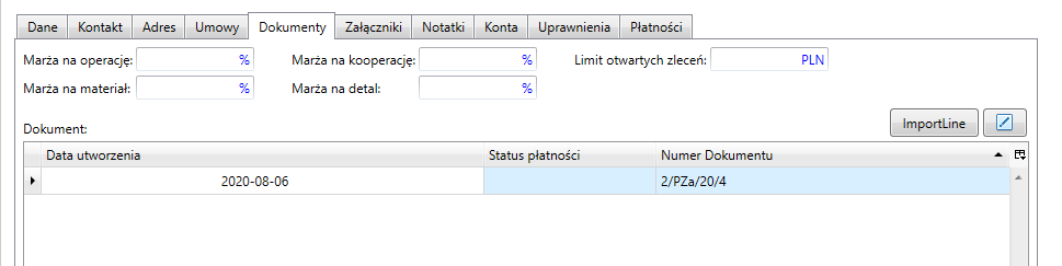 Zakładka Dokumenty przechowuje typy dokumentów przypisane do kontrahenta np. zamówienia, faktury, WZ, PZ.