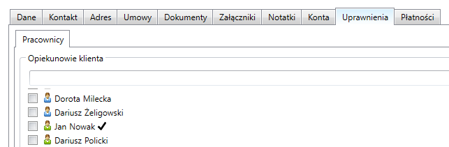 W zakładce Uprawnienia istnieje możliwość ustalenia opiekuna klienta oraz osoby mogące edytować dokumentację z nim związaną.