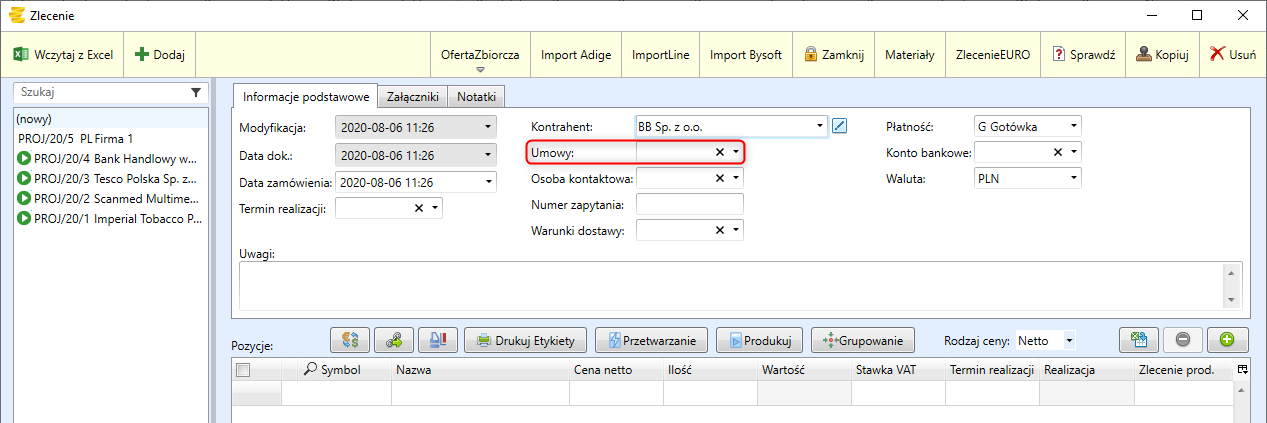 W momencie gdy tworzymy zlecenie produkcyjne wybieramy kontrahenta. Po wyborze kontrahenta gdy mamy dla niego zdefiniowane kontrakty pojawia się dodatkowe pole Umowy w którym możemy wybrać interesujący nas kontrakt.