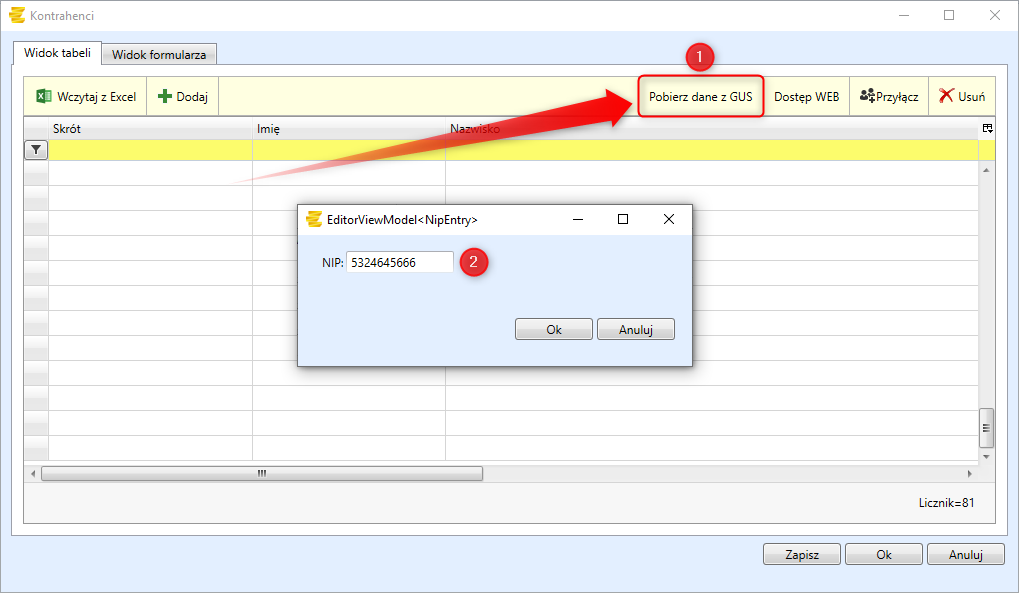 Po wejściu w zakładkę "Konfiguracja -> Kontrahenci" po prawej stronie okna widnieje przycisk "Pobierz dane z GUS" (Można również wygenerować dane z okna "Dodaj" -> Pobierz dane z GUS). Po jego kliknięciu wyskakuje okno, w którym należy wpisać NIP danego kontrahenta:
