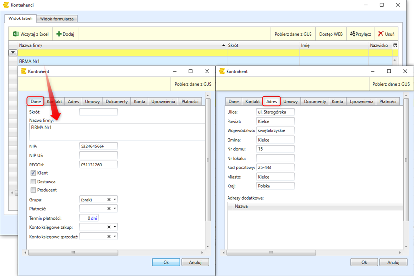 Adres firmy należy podać w osobnej zakładce o nazwie Adres.