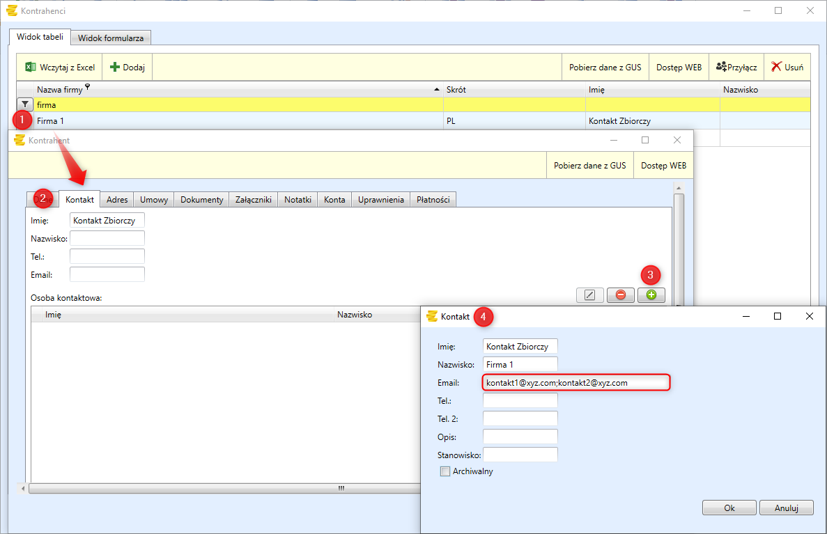 W zakładce "Kontakt" istnieje możliwość wprowadzenia Kontaktu zbiorczego za pomocą przycisku
