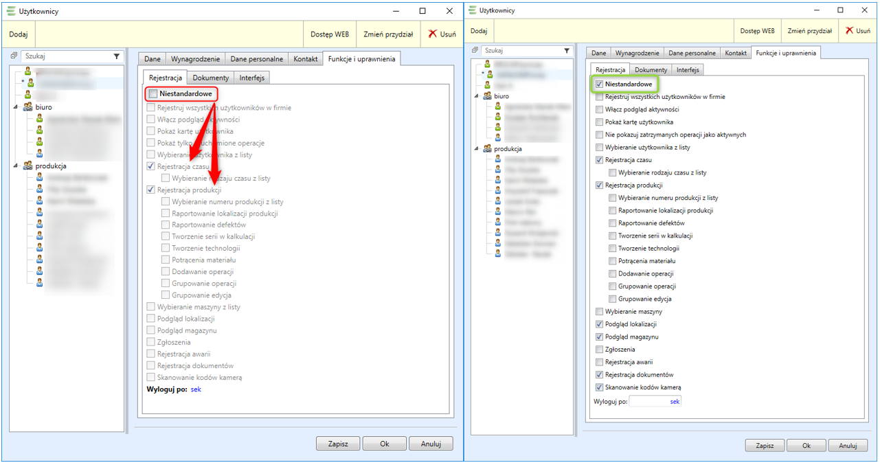 W celu nadania uprawnień dla magazyniera należy otworzyć ścieżkę: Konfiguracja -> Użytkownicy -> Funkcje i uprawnienia. Domyślnie ustawione są ustawienia standardowe, które pozwalają jedynie na rejestrację czasu pracy pracowników i na rejestrację produkcji. Ustawiając funkcje niestandardowe istnieje możliwość nadania uprawnień pod danego pracownika.