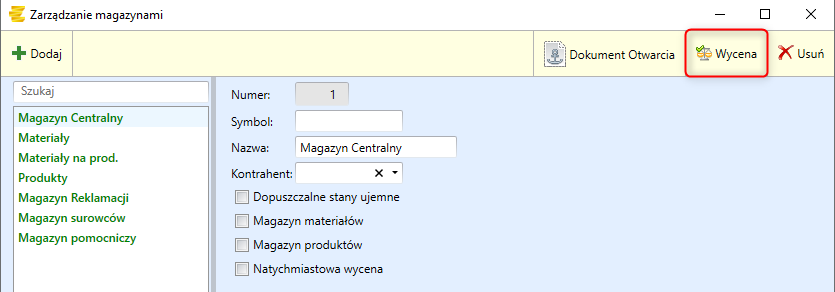 Wycena polega na ustaleniu ceny zakupu rozchodowanych towarów i materiałów. Stanowi podstawę do ustalenia kosztów wytworzenia produktów. W programie DataERP Wycena znajduję się w zakładce: Konfiguracja->Magazyny.