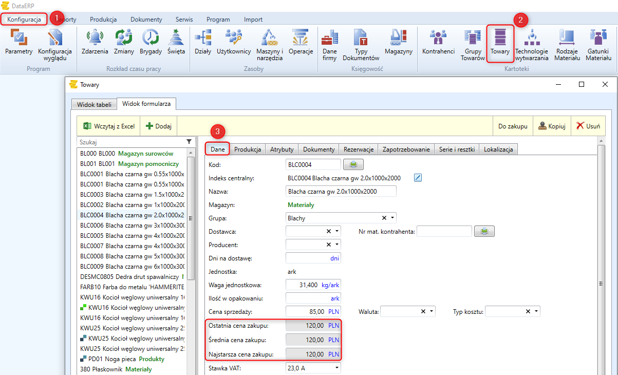 Konfiguracja -> Towary -> Wybór towaru z listy -> Dane.