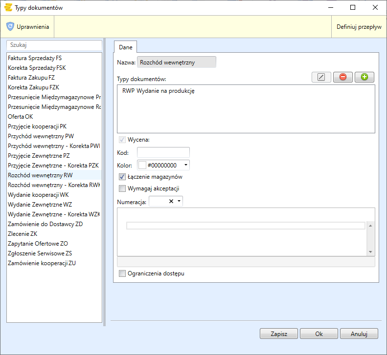 Domyślnie w systemie nie są wprowadzone żadne typy dokumentów dlatego próba utworzenia pierwszego dokumentu np: Rozchodu wewnętrznego,