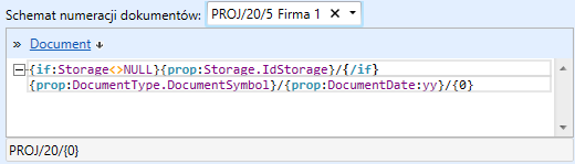 Przykładowy dokument został stworzony w magazynie, posiada symbol dokumentu '''PROJ''' i został utworzony w 2020 roku "yy" oznacza formatowanie daty do ostatnich 2 cyfr roku. Ostatnim parametrem jest fragment tekstu {0}, który oznacza podstawienie w to miejsce kolejnego numeru.