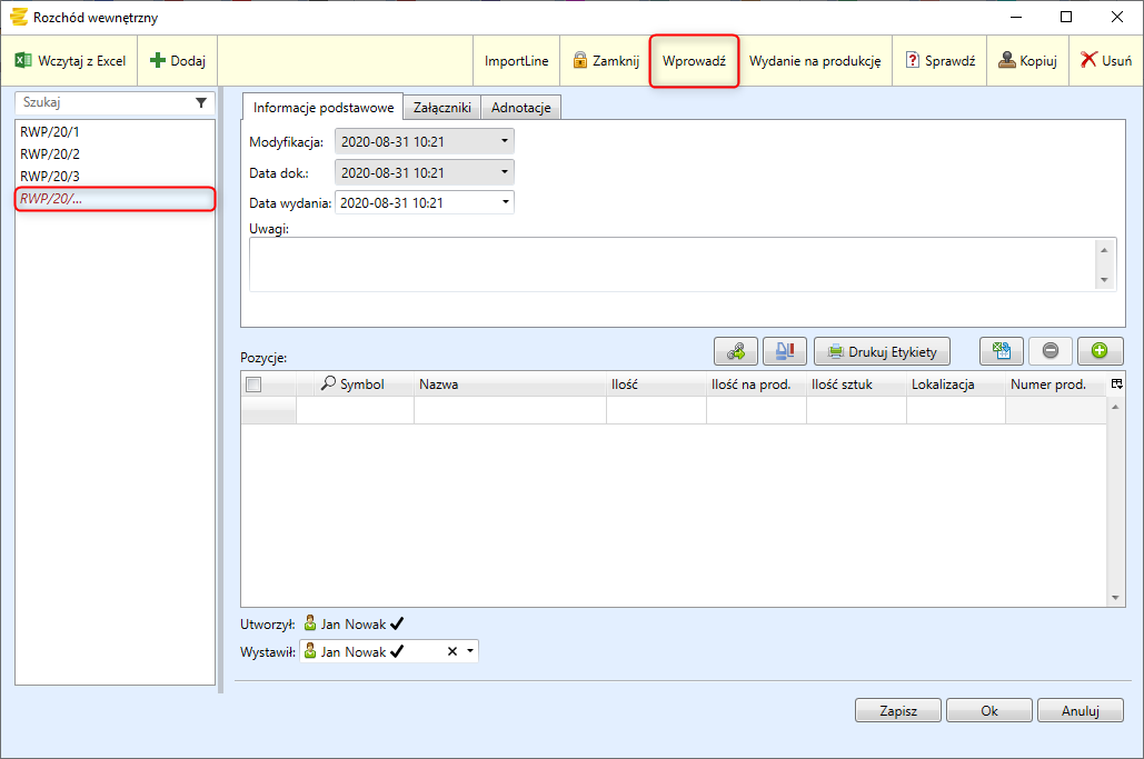 Przycisk Wprowadź umożliwia sprawdzenie poprawności dokumentu i zapisanie go do bazy Przed wprowadzeniem do bazy na liście wyświetla się w kolorze czerwonym tylko szablon numeracji gdzie w miejscu kropek po wprowadzeniu pojawi się kolejny numer.