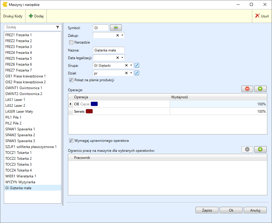 - Operacje - określenie czynności, które będą wykonywane na danej maszynie. Zaznaczenie pola wydajność, pozwala na sformułowanie procentowej wydajności pracy konkretnej maszyny w trakcie trwania danej operacji.