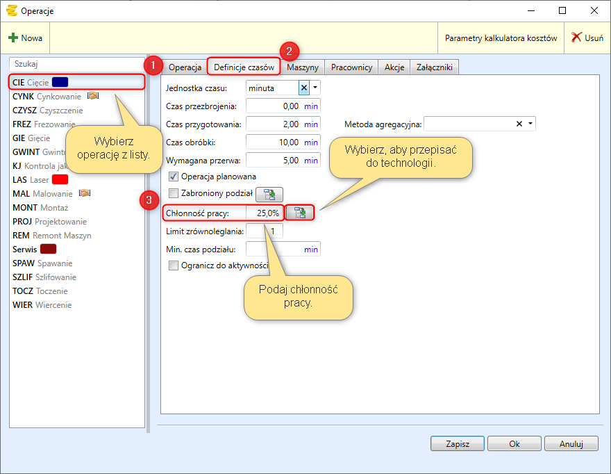 Użytkownik wybiera w pierwszej kolejności z listy daną operacje. W zakładce definicje czasów należy podać procentową chłonność pracy. Przycisk