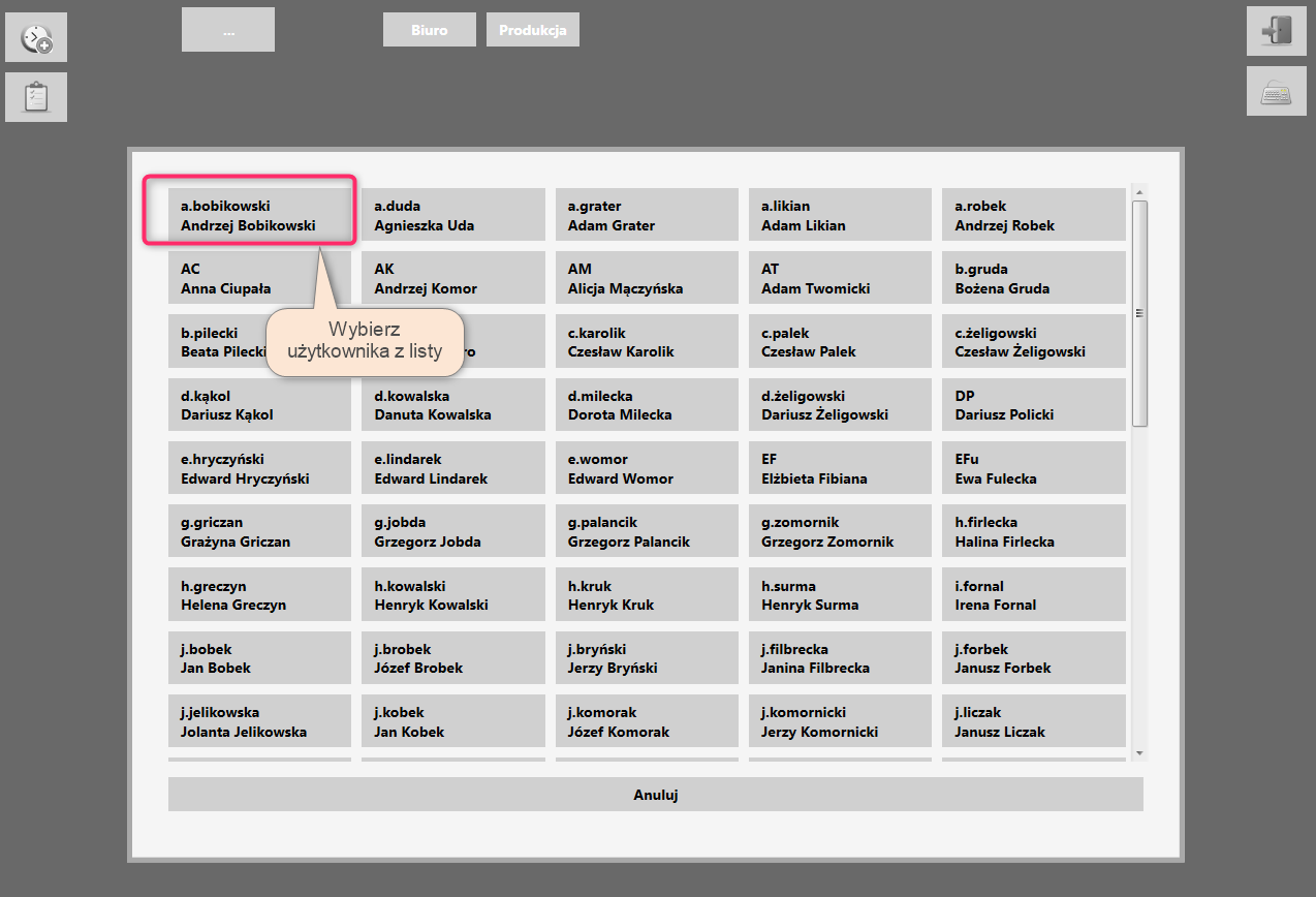 W sytuacji gdy nie zostały przypisane identyfikatory użytkownikom, istnieje opcja wyboru użytkownika z listy, wówczas powinny zostać zaznaczone opcje rejestruj wszystkich użytkowników w firmie oraz wybieranie użytkownika z listy.