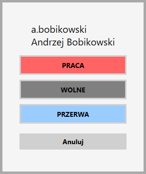 Jeżeli pracownik rozpoczyna pracę wybiera z listy Praca, w przypadku pójścia na przerwę Przerwa, wyjścia/zakończenia pracy Wolne.