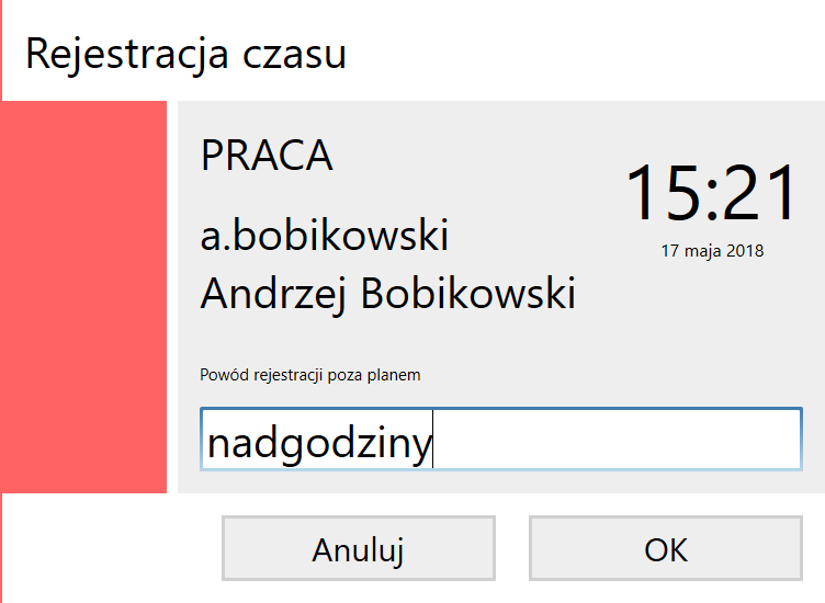 Pracownik rejestrujący się do systemu poza ustalonym planem, powinien podać powód logowania.