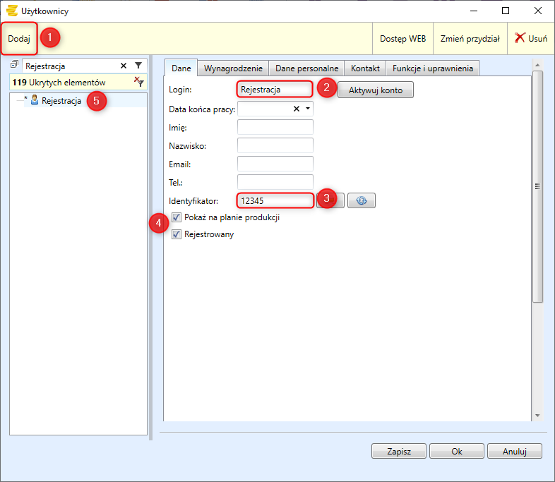 W systemie możliwe jest utworzenie grupowego użytkownika o nazwie Rejestracja za pomocą którego, pracownicy będą rejestrować swoją obecność. W pierwszej kolejności należy rozpocząć od zdefiniowania loginu, w menu programu Konfiguracja -> Użytkownicy.