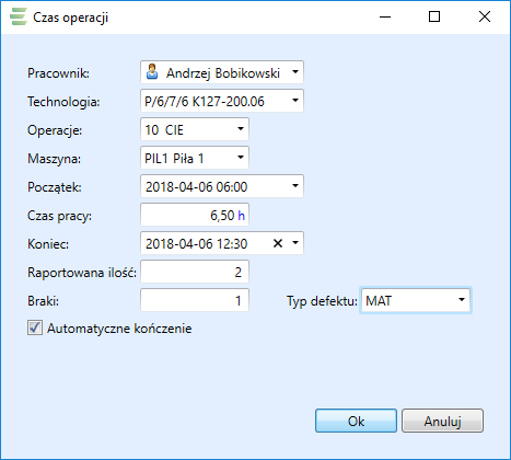 Pierwszym krokiem jest określenie pracownika, a następnie zdefiniowanie technologii oraz przypisanie do niej operacji. Po wybraniu operacji wyświetli się dodatkowe pole maszyna, w którym możliwe jest określenie maszyny na której operacja została wykonana. Początek podpowiada się automatycznie biorąc pod uwagę zmianę na której pracownik ma pracować. Jest to data rozpoczęcia operacji. Czas jest to czas poświęcony przez pracownika na wykonanie czynności na danej operacji. Koniec zostaje podany tylko wtedy gdy dana czynność została zakończona na danej operacji przez pracownika. Wykonaną ilość produktu należy wprowadzić w polu Raportowana ilość. Pole braki pojawi się po zaraportowaniu określonej ilości. W sytuacji wystąpienia defektu, możliwe jest również określenie jego typu. Włączenie pola Automatyczne kończenie spowoduje, w przypadku zaraportowanej ilości równej wielkości zamówienia lub będącej jej brakującą ilością automatyczne zakończenie produkcji.