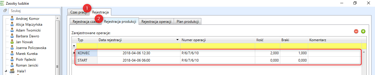 Zmiany wywołane zarejestrowaniem operacji za pomocą programu, zostaną również zapisane w zakładce Produkcja -> Pracownicy. Automatycznie przy pracowniku zostanie zaraportowana produkcja, którą wykonał.