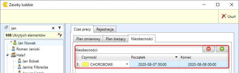 - Nieobecności - pozwala na ustalenie czynności (przyciski "+" oraz "-") odpowiedniej dla danej nieobecności użytkownika oraz zakresu jej występowanie poprzez ustawienie dat oraz godzin.