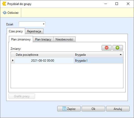 W celu zbudowania harmonogramu przypisanego do pracownika należy określić plan zmianowy z poziomu zakładki Czas pracy -> Plan zmianowy. Następnie za pomocą przycisku Dodaj określamy datę początkową, czyli datę rozpoczęcia pracy wg. planu oraz Brygadę, na której pracownik będzie pracował.