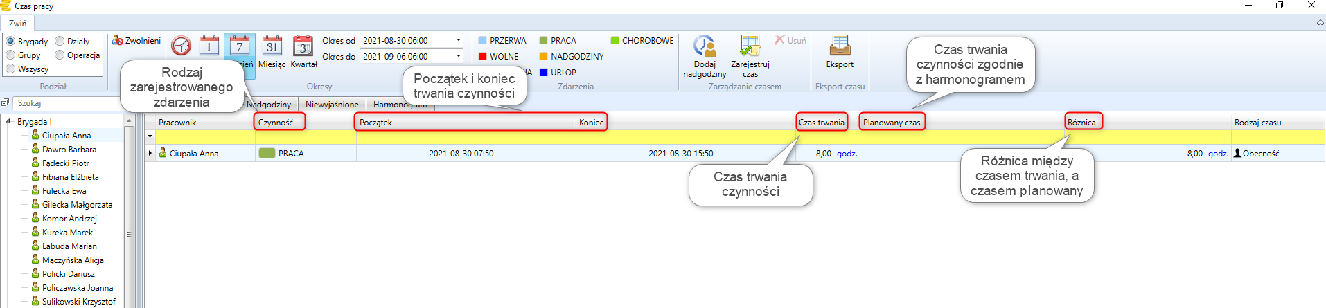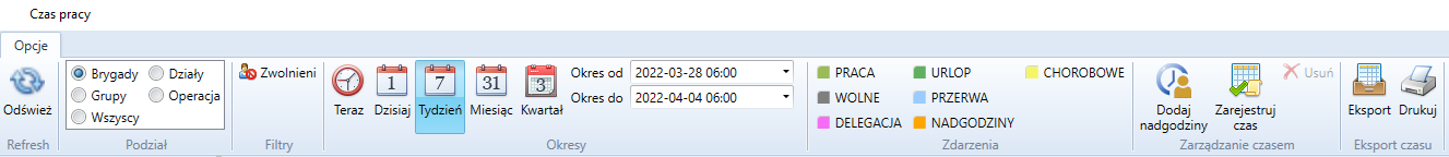 - Czas pracy - obejmuje zarejestrowane czasy pracy pracowników.