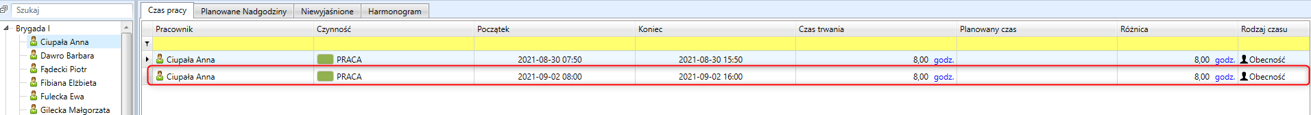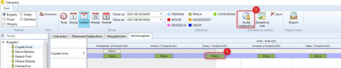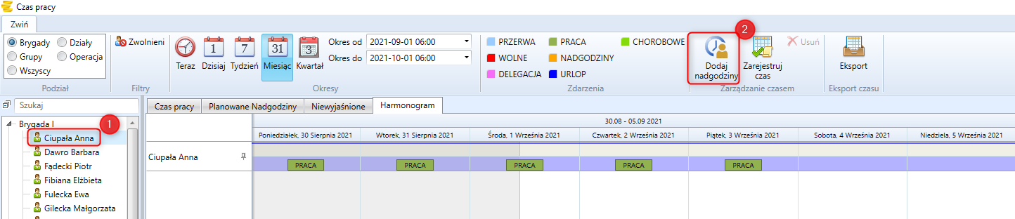Dodanie nadgodzin dla pracownika: Anna Ciupała w dn. 02.09.2021r. w godzinach: 6:00-8:00.