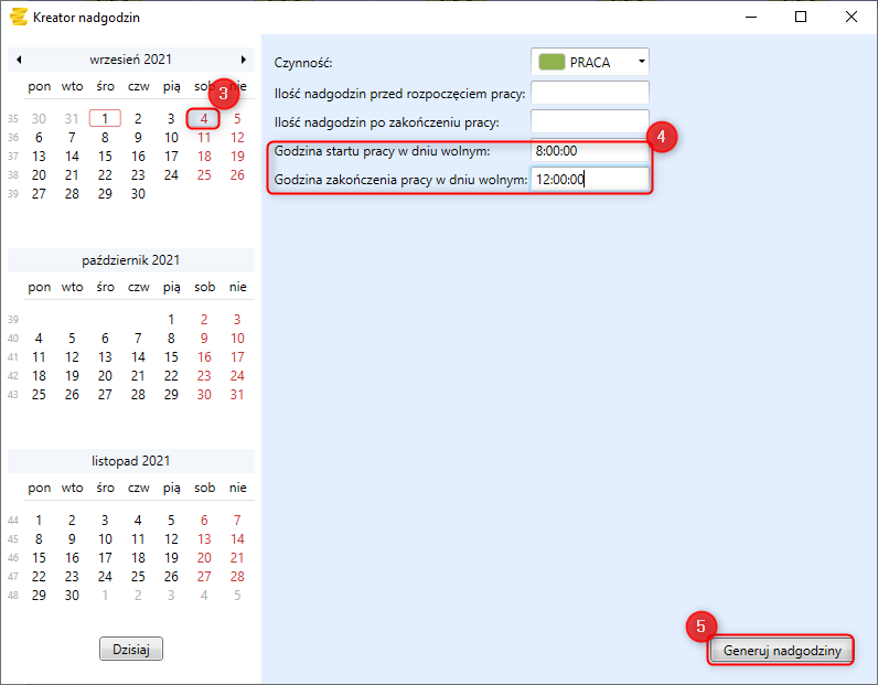 W kolejnym kroku w kalendarzu wybierz datę nadgodzin(3). Następnie w polach Godzina startu w dniu wolnym oraz Godzina zakończenia pracy w dniu wolnym określ przedział nadgodzin(4) i zatwierdź za pomocą przycisku Generuj nadgodziny(5).