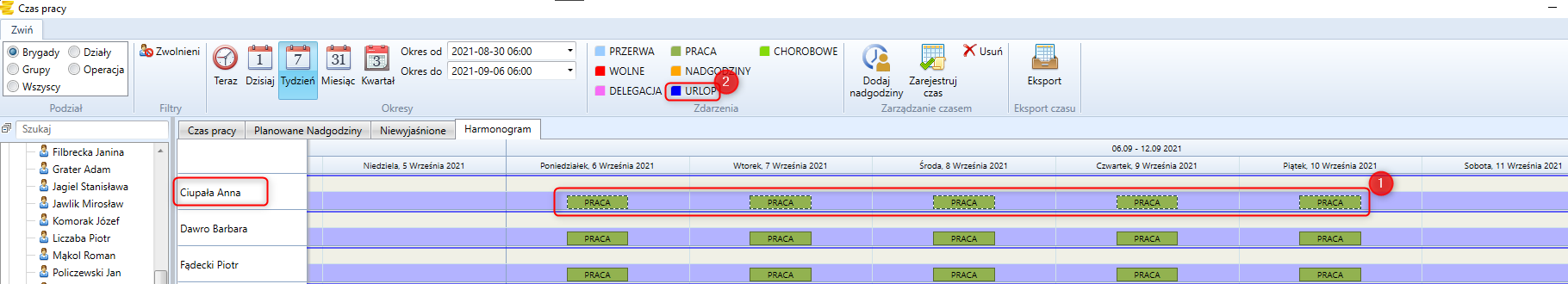 Zaplanowanie w harmonogramie czasu pracy tygodniowego urlopu wypoczynkowego dla pracownika Anna Ciupała w terminie 6.09-10.09.2021r.