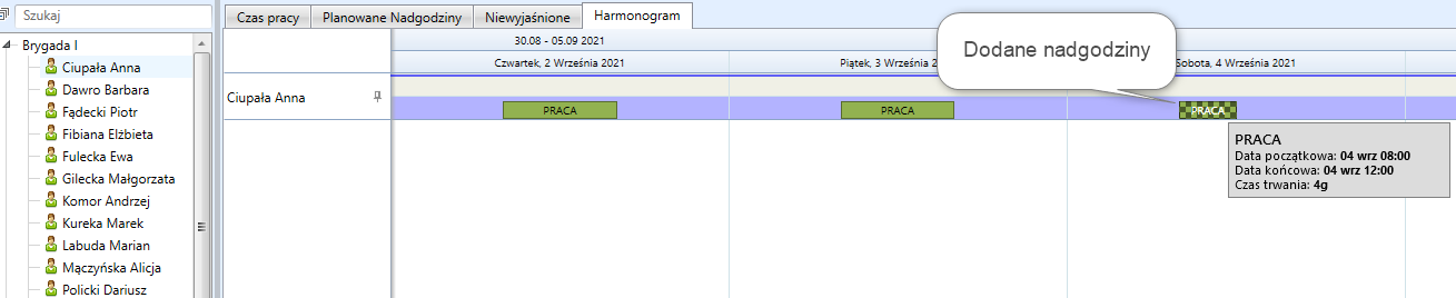 Informacja o zdefiniowanych nadgodzinach automatycznie umieszona jest na Harmonogramie oraz w zakładce Planowane nadgodziny.