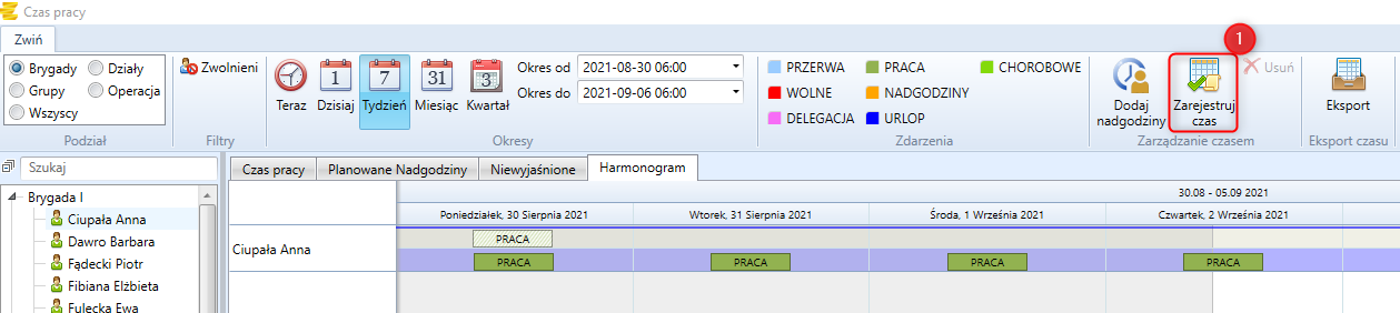 W sekcji Zarządzanie czasem naciśnij przycisk Zarejestruj czas(2).